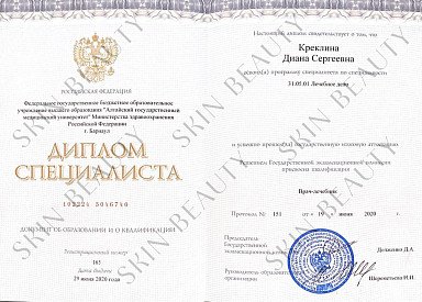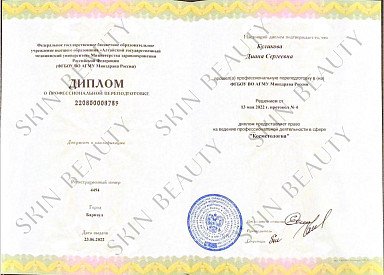 2022 г. - Первичная профессиональная переподготовка по косметологии на базе кафедры дерматовенерологии, косметологии и иммунологии АГМУ.