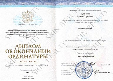 2022 г. - Ординатура по дерматовенерологии на базе кафедры дерматовенерологии, косметологии и иммунологии АГМУ